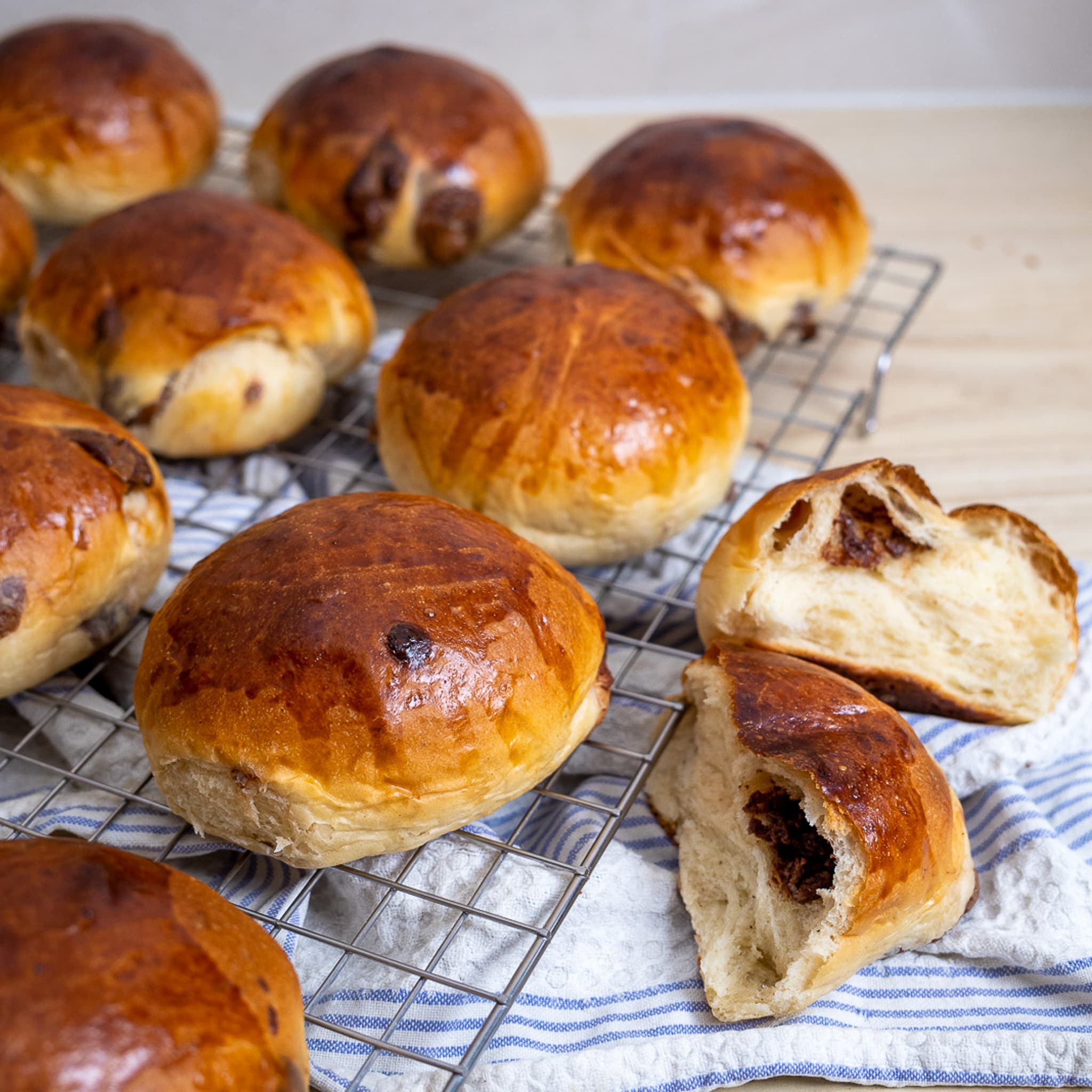 7. Del deigen i 16 like store emner og trill til boller. Dek med lunkent, fuktig kjøkkenhåndkle. La heve i minst 20 min.